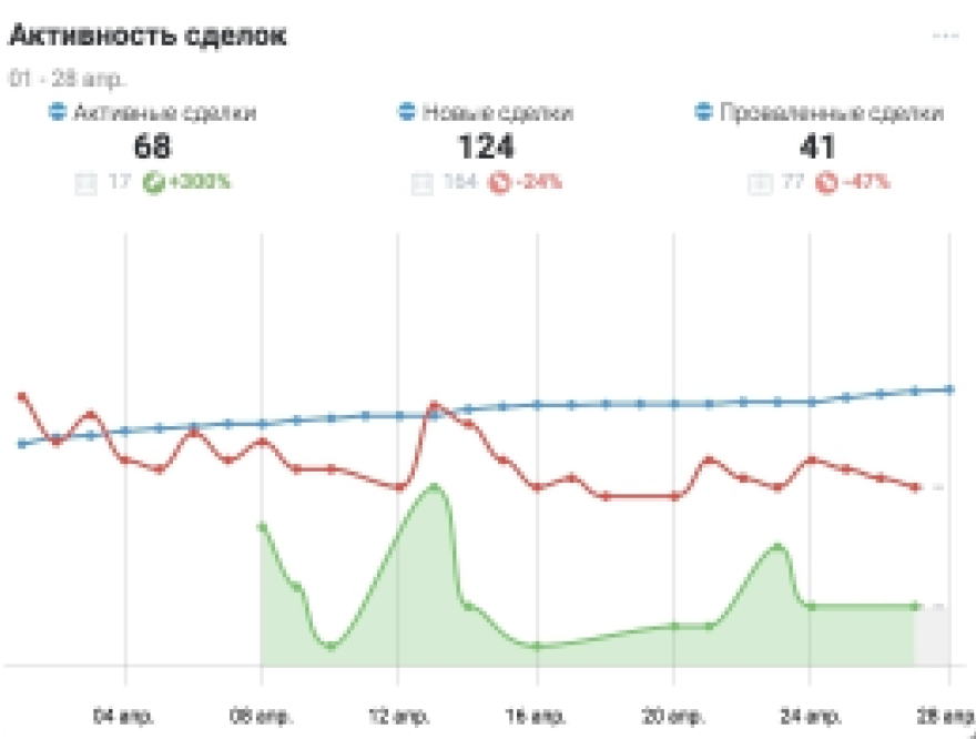Активные сделки помогут вам увидеть какое количество людей или компаний заинтересовано в ваших услугах/товарах. Используйте этот показатель для планирования загрузки менеджеров в отделе продаж.
