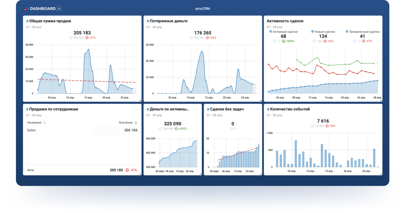Следите за продажами, активностями и общим темпом. Любой дашборд можно донастраивать и выводить на него дополнительные метрики.