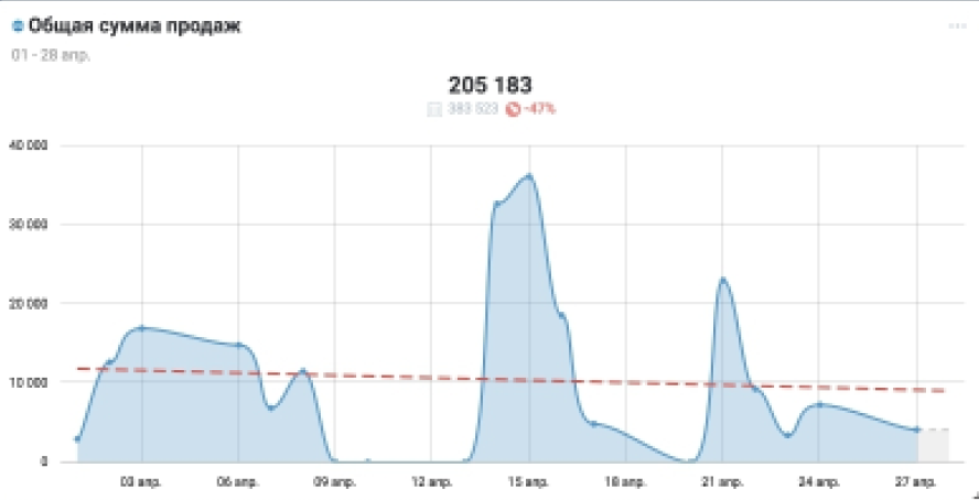 Данный график отражает общую сумму продаж с начала месяца по сегодняшний день. Для этого виджета был намеренно выбран линейный график, так как он позволяет визуально проследить динамику роста или падения.