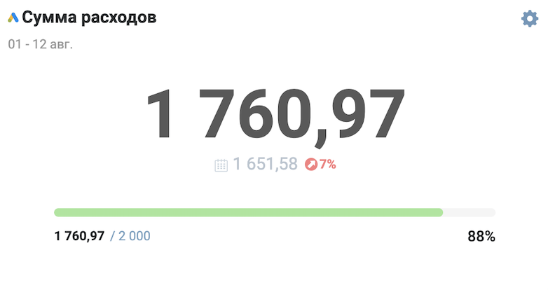 Наблюдайте за суммой расходов на рекламу Google Ads. Назначайте ваш рекламный бюджет как цель и отслеживайте «план/факт» затрат на контекстную рекламу.