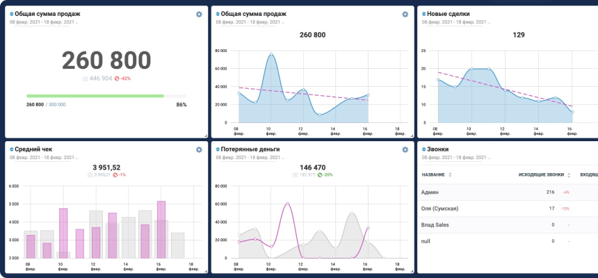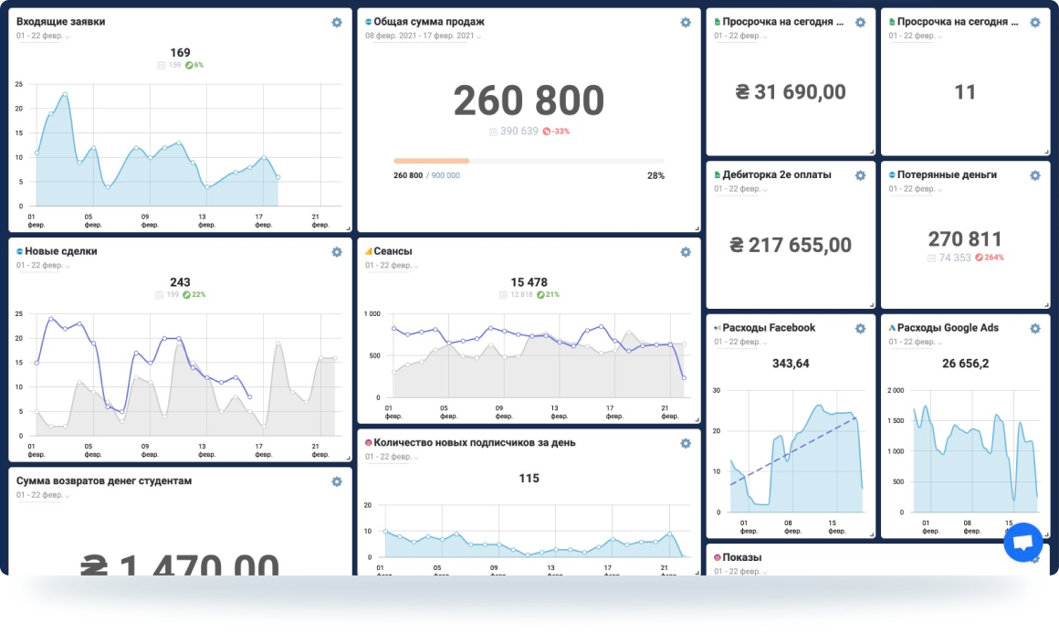 Потерянные деньги (нереализованные сделки из AmoCRM) - сегодня сумма всех сделок в период с 1 по 22 февраля составляет 270 811 грн;