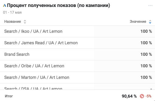 Говорит о том, какую долю изо всех возможных показов в поиске занимает ваша реклама, с разбивкой по кампаниям.