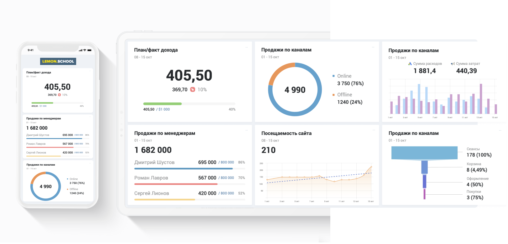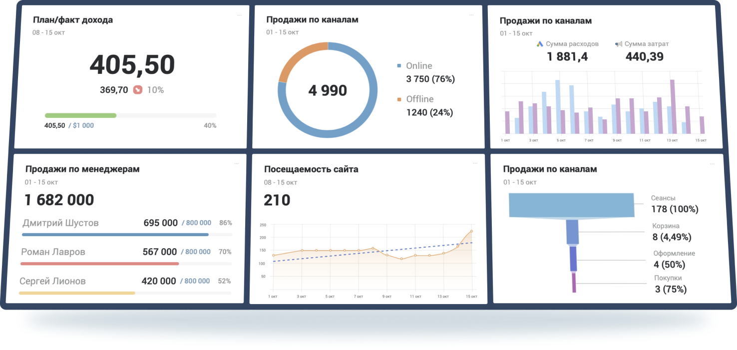 Это сервис, предназначенный для владельцев и руководителей. Который позволяет взять под контроль ключевые метрики бизнеса и вывести их на 1 наглядный дашборд.